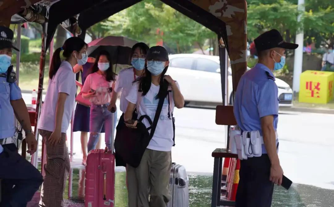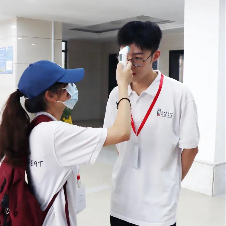 校门口,同学们在出示健康码、行程码和校园通行码绿码并进行体温检测后进入校园。志愿者们手持各式标语,接过新生的行囊,有序引导他们前往新生报到现场,并送上衷心的祝福。新生在签名墙前合影留念后,快速完成报到确认、材料领取等手续,并在志愿者们的引导下乘坐专用摆渡车到达学生公寓。