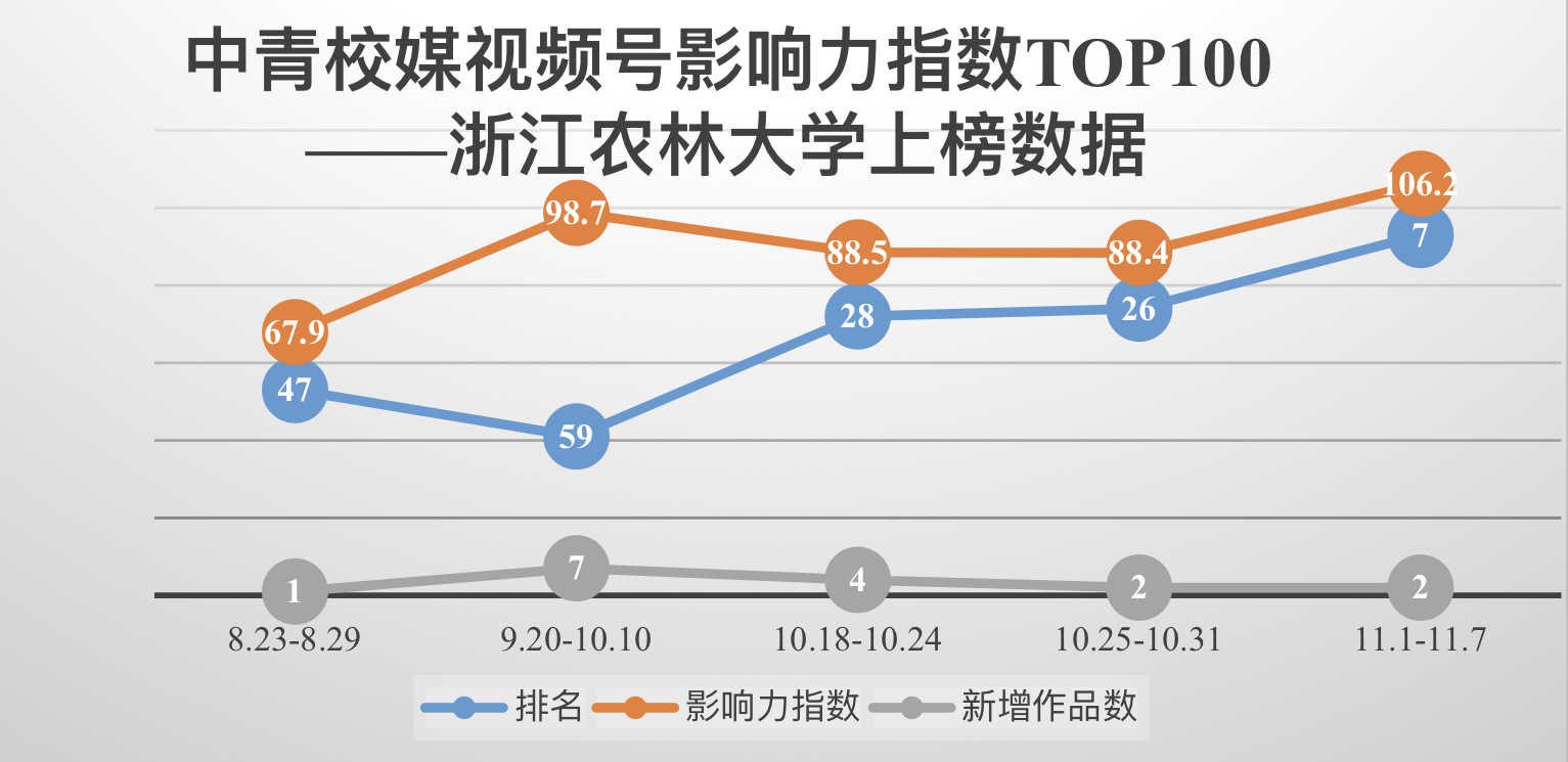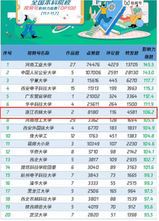 11月8日,中青校媒发布最新一期全国高校(本科院校/职业院校)视频号影响力指数TOP100,beat365官网视频号首次冲进前10名,位居全国本科高校第7位,成为浙江省唯一一个跻身该排行榜前10名的高校视频号。