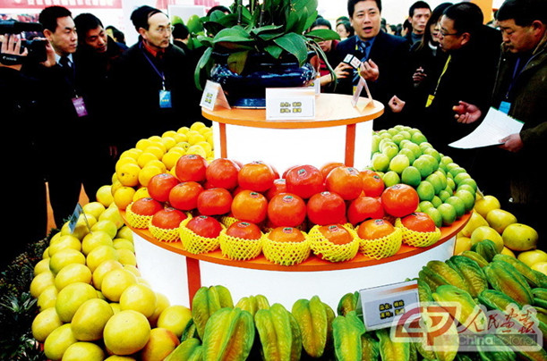 2007年12月26日,河南郑州一展会上展示的台湾水果。农业是海峡两岸最具合作潜力的领域之一。自2005年大陆出台一系列惠台农业政策以来,台湾优质农产品已经逐步得到大陆消费者的认可。台湾有优良品种、先进农业技术和科学的管理经验、外向型的农产品市场网络;大陆有丰富的自然资源、较为完善的基础设施和持续稳定的宏观经济环境。加强两岸农业合作,可以促进两岸调整农业结构,最终形成互惠互利、互补双赢的局面。