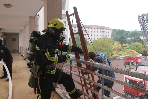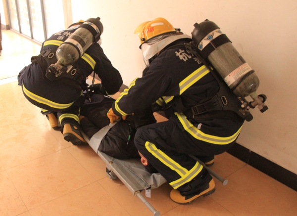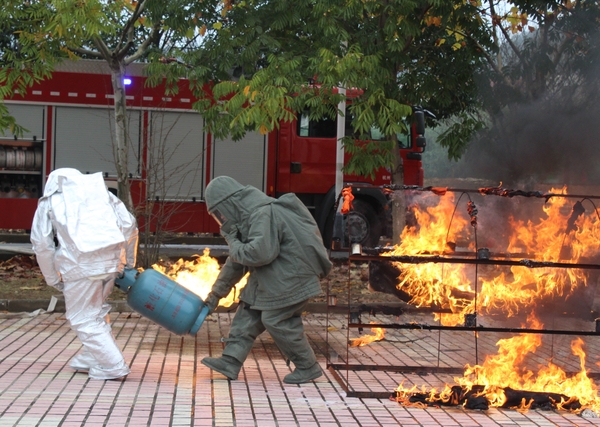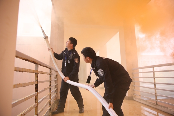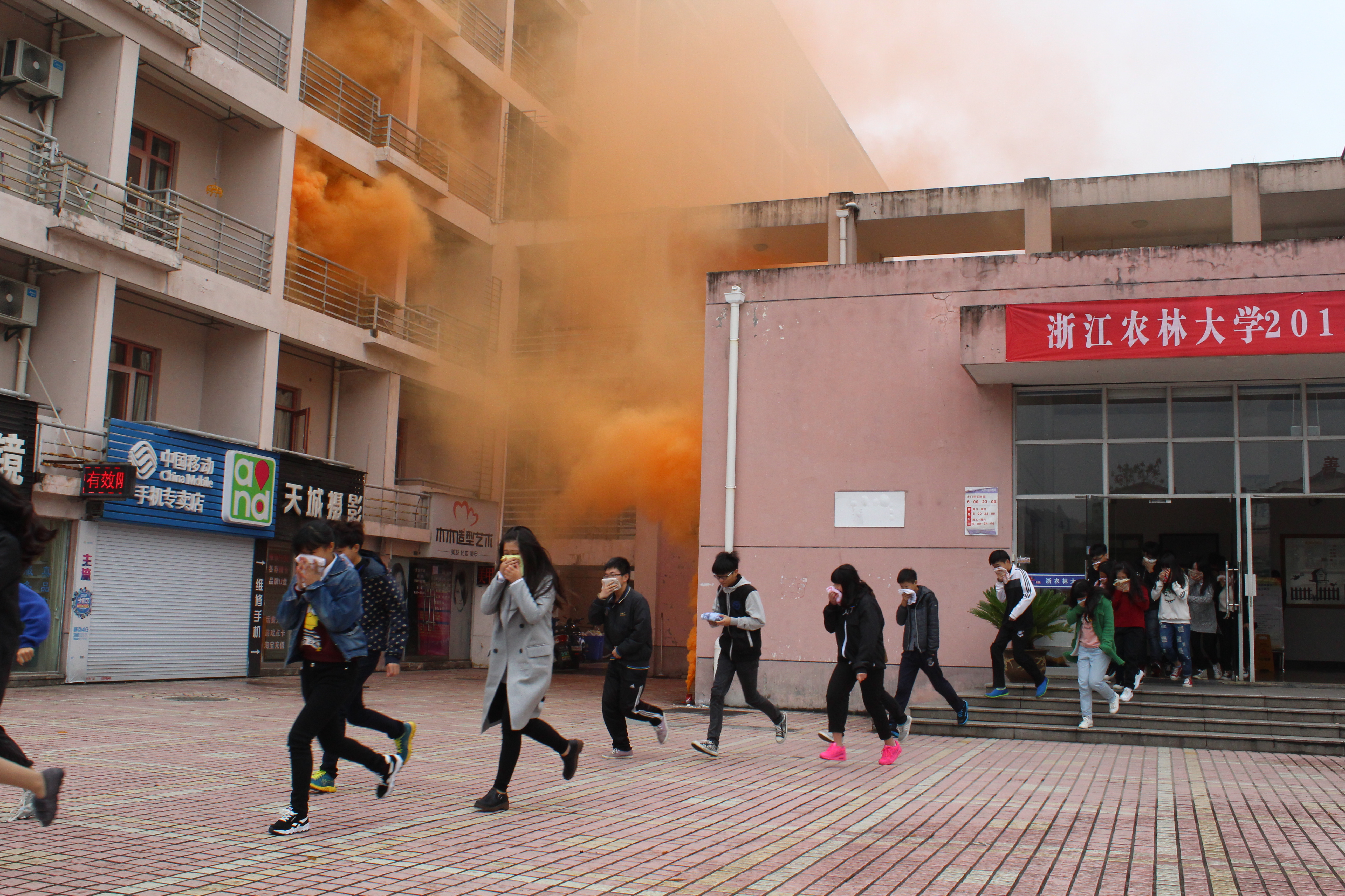 现场模拟学生宿舍发生火灾,公寓值班员立即拨打“校园110”报警电话,指挥中心立即启动beat365平台唯一官网应急预案,迅速调集校志愿消防队员赶赴“火灾现场”开展灭火、疏散。被困学生在楼宇疏散引导员的指导下用湿毛巾捂住口、鼻,弯着腰,沿墙角、楼梯有序撤离。