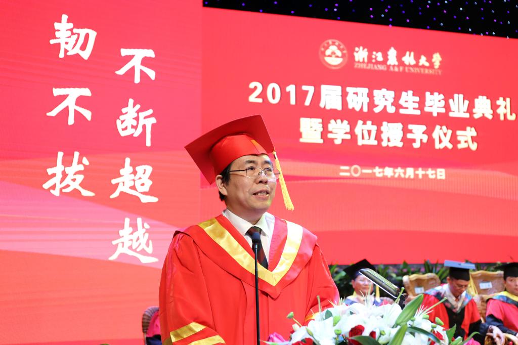 6月17日,学校隆重举行2017届研究生毕业典礼暨学位授予仪式。校党委书记周国模,校长应义斌,校学术委员会副主任、中国工程院院士喻树迅,副校长王自勇、金佩华、沈希、沈月琴,校党委委员、宣传部部长胡祖吉,校党委委员、组织部部长童晓晖等出席典礼,典礼由校党委副书记史永安主持。