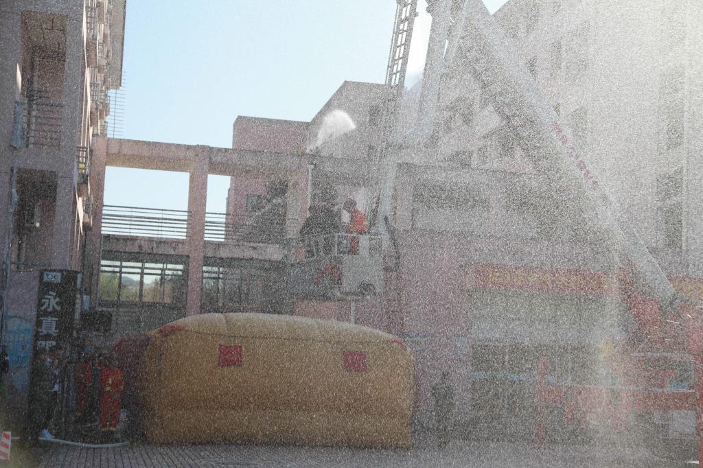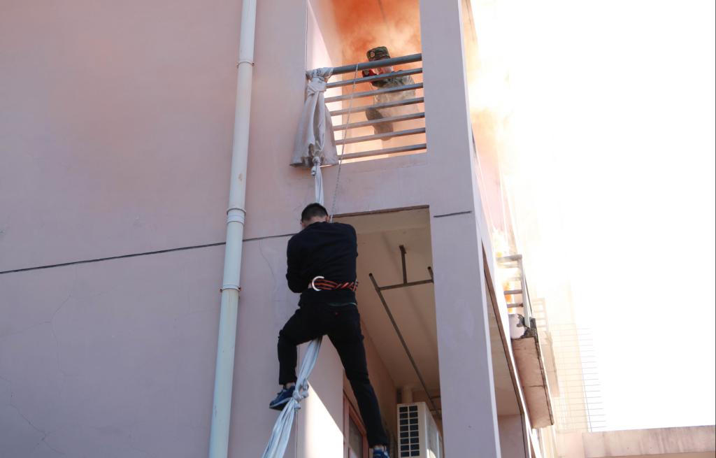 消防灭火救援演练开始。A3、A4学生公寓浓烟四起,学生发现火情后,紧急呼救,公寓管理员立即拨打“校园110”报警并发出火警信号,指挥中心接警后,迅速启动beat365平台唯一官网突发事件应急处置预案,指挥应急队员及校卫队员赶赴“火灾现场”开展灭火、警戒和人员疏散。楼宇疏散引导员指挥被困学生用湿毛巾捂住口、鼻,单列、靠右沿楼道有序撤离。第一梯队学生公寓志愿消防员火速达到现场施救,随后,第二梯队微型消防站消防队员、志愿消防队员紧急到达火灾现场救援。临安区消防大队接警后,出动应急救援车、消防车等多辆消防车和30余名消防官兵,及时赶到现场救援,消防官兵充分运用高空云梯、竹梯、气垫、高空缓降等方式,施救被困人员,待人员有序撤离后,迅速扑灭火患。