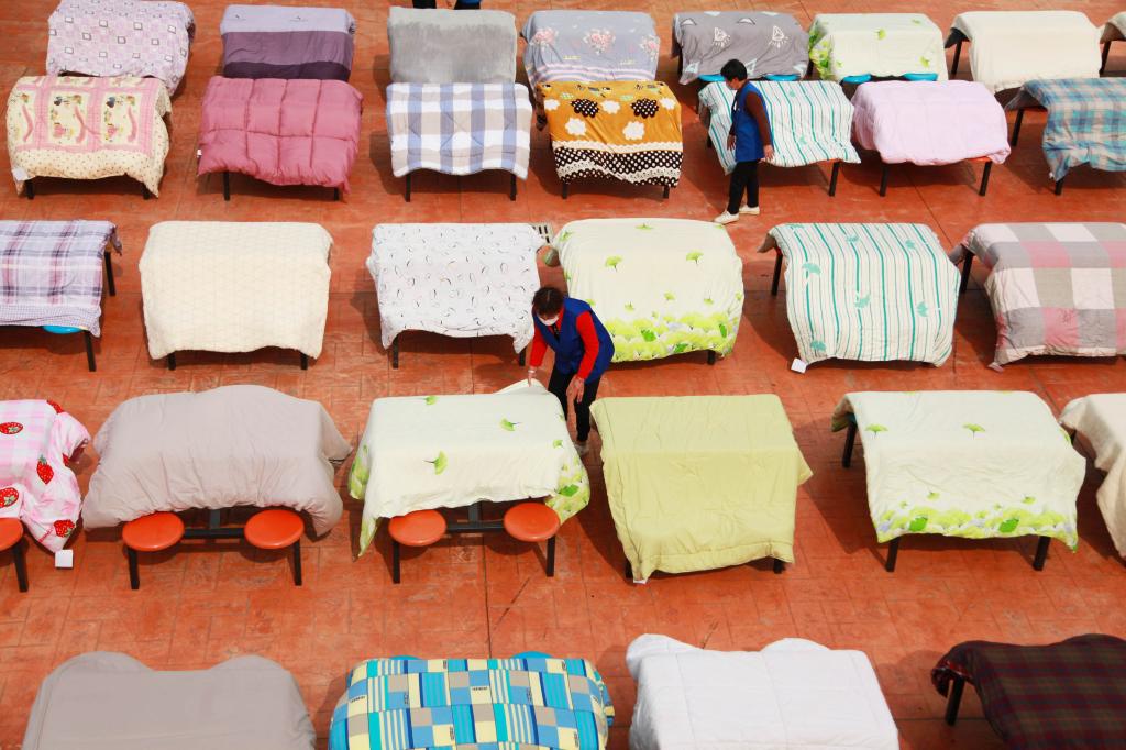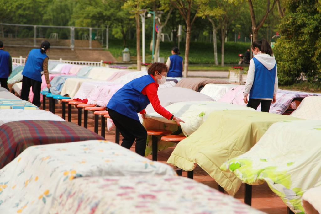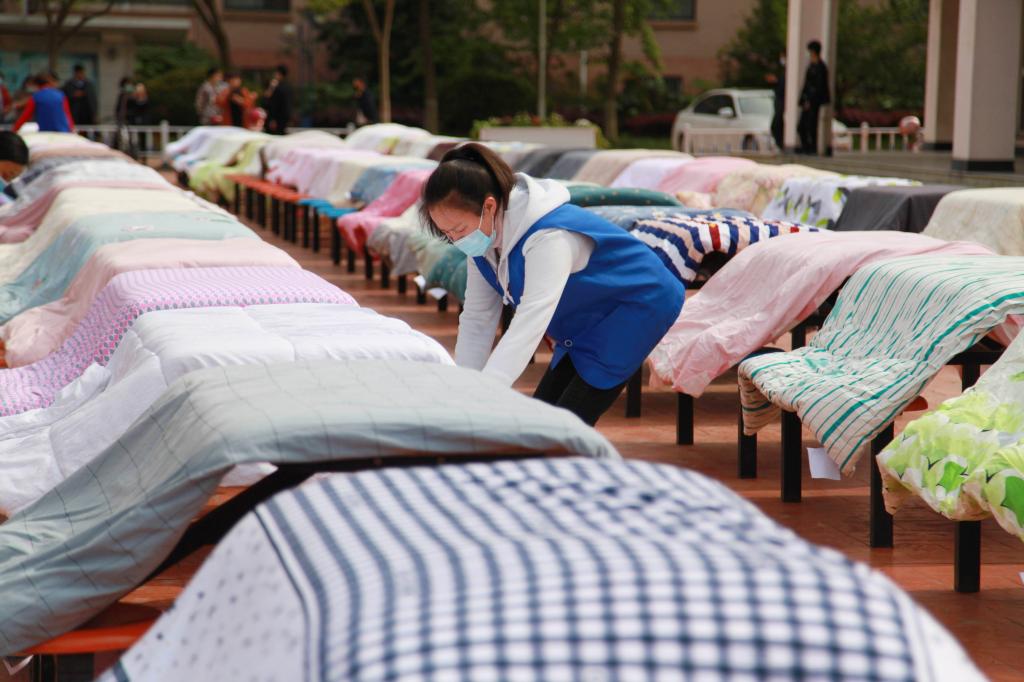 4月21日,学校公布了开学返校时间。为迎接学生返校,学校后勤集团组织党员志愿者、宿管阿姨等帮学生晒被子。有晒被子需求的学生,可通过微信群等平台联系所在公寓的宿管阿姨,党员志愿者、阿姨们则会根据学生预约需求,给每条被子做好标记,结合天气情况进行晾晒。