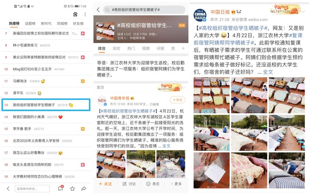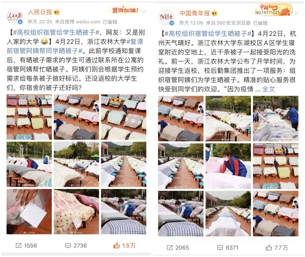 相关媒体纷纷以“贴心晒被”“别人的大学,寝室里的被子,阿姨给晒了!”“用贴心的行动温暖即将开学返校的学子”“壮观,杭州这所学校晒了800多床被子!背后的故事和阳光一样暖”“杭州:大学宿管阿姨给学生晒好被子迎开学”等为题,纷纷关注报道beat365官网践行育人初心、服务学生需求的这一贴心服务、暖心举措……同时,“高校组织宿管给学生晒被子”的话题还登上微博热搜,被“人民日报”、“中国青年报”、“中国日报”等官方微博点赞,获得网友高度支持,家长及学生们竖起大拇指连声夸赞:学校太贴心了!我的孩子就要报考这样的大学。