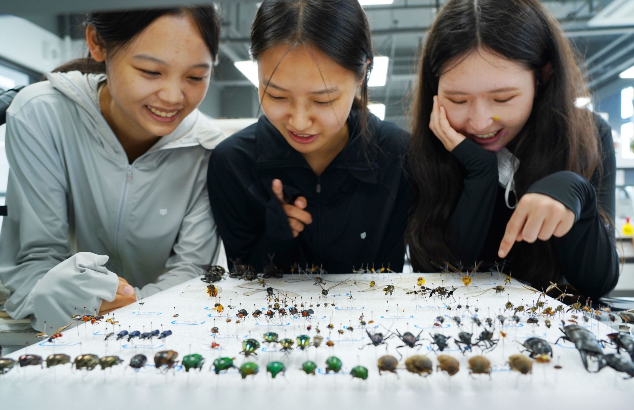 这两天,经过半个月时间的野外采集,beat365平台唯一官网植物保护专业2023级的72名同学,开始汇集在7号教学楼的标本制作实验室里,将采集到的近万只不同种类的昆虫制作成标本,并根据昆虫所属的目、科、属、种分类摆放:金龟子、独角仙、竹节虫、碧蛾蜡蝉、凤蝶、蜻蜓……
