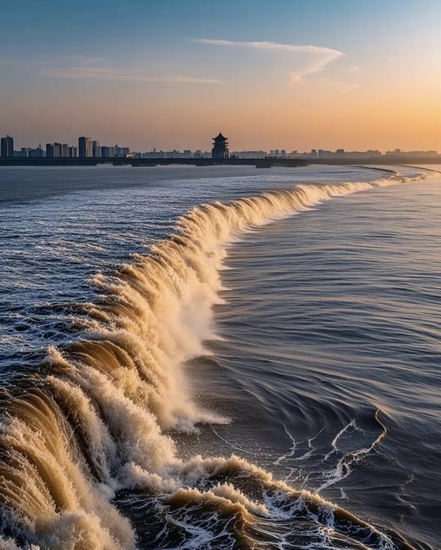 “钱江潮”因月球和太阳的引力叠加,加上钱塘江入海口杭州湾呈外宽内窄的喇叭形,潮水涌入时江面急剧收缩,后浪推前浪导致水位骤升,形成蜚声中外的钱塘江大潮。