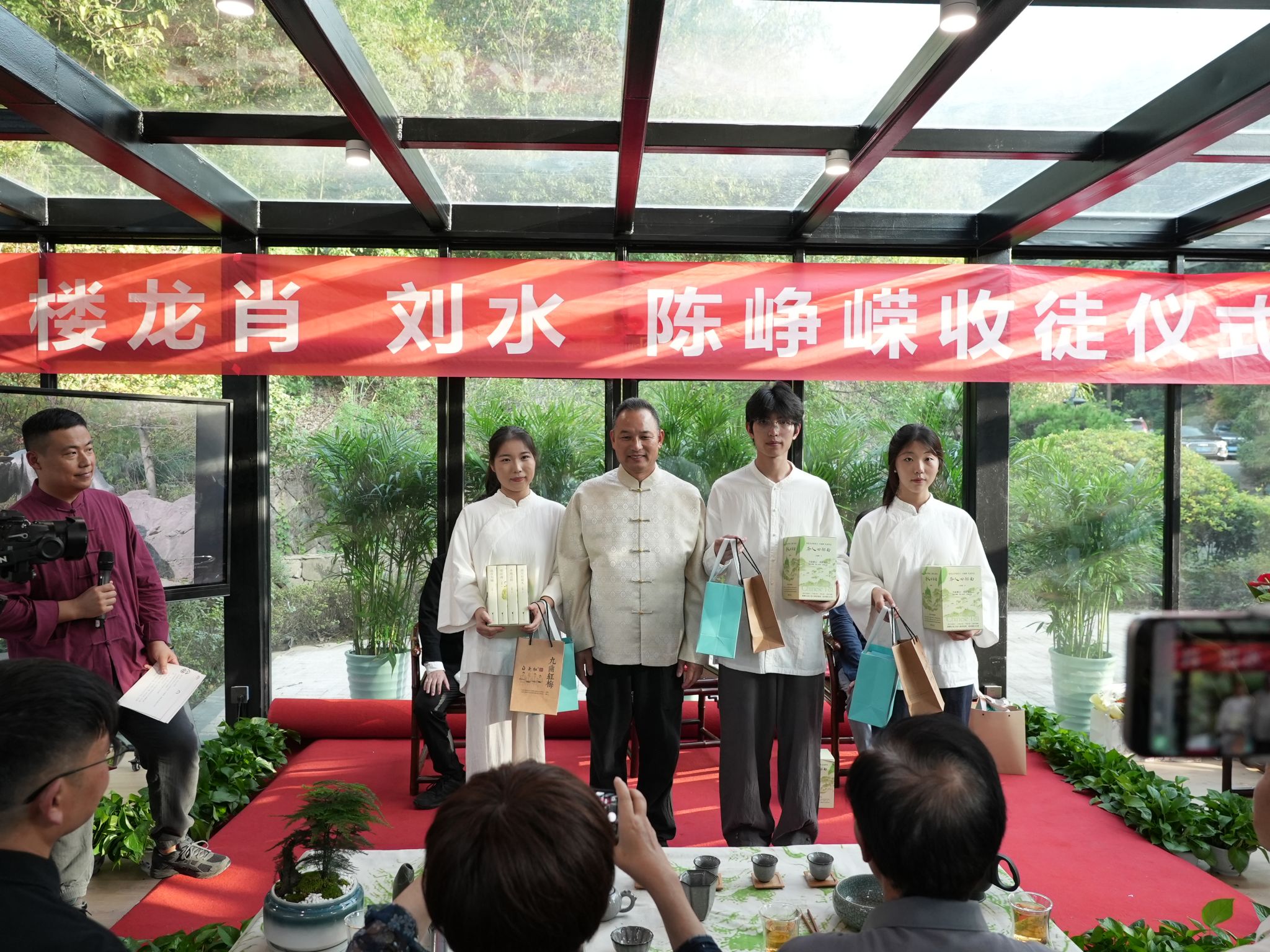 本次收徒的三位非遗大师——九曲红梅茶制作技艺传承人楼龙肖、柘荣高山白茶制作技艺传承人刘水、桂花龙井茶制作技艺传承人陈峥嵘,共同接收七位弟子。拜师仪式上,弟子们依次完成洗茶、注水、奉茶等传统茶艺流程,展现出茶文化的庄重典雅。全体参与者肃立致敬茶圣陆羽,表达对茶文化传统的尊崇与传承责任。