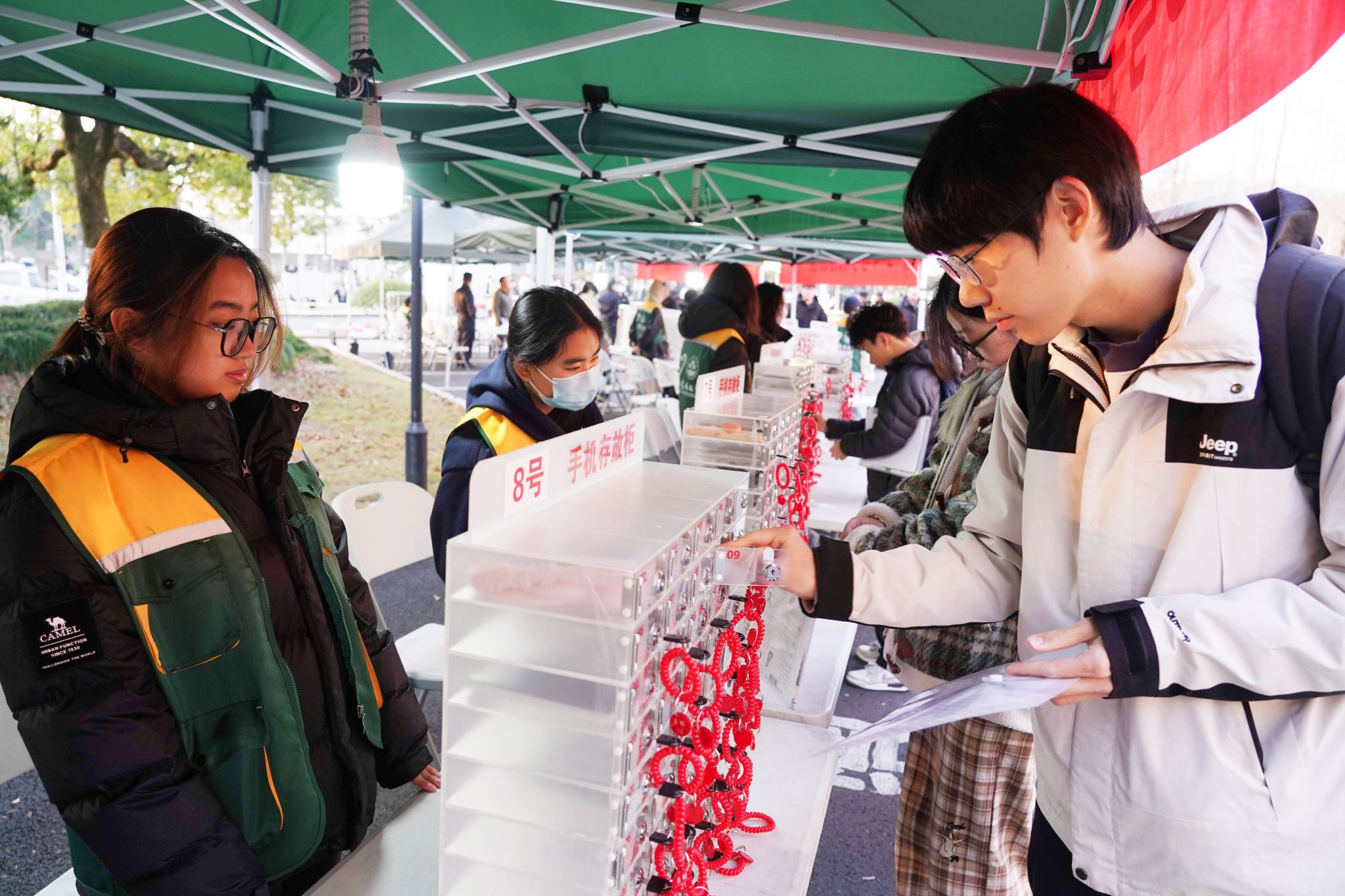 beat365平台唯一官网考点,考生将手机寄存在考场外的手机存放柜。