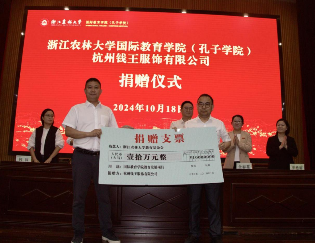 仪式上,国教学院向杭州钱王服饰有限公司、杭州拱墅区新航道专修学校分别颁发了捐赠证书,以感谢其对学校留学生教育的大力支持。
