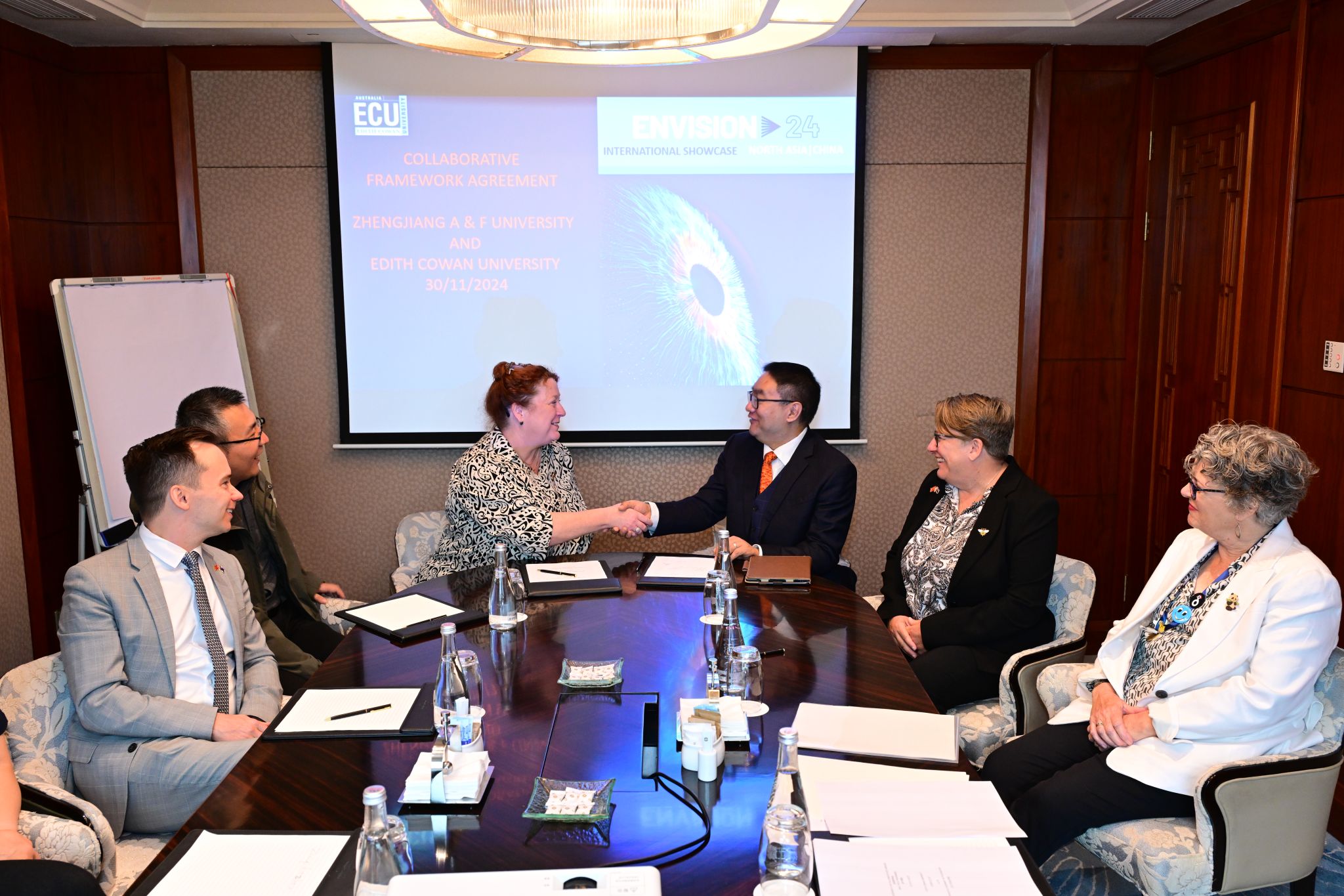 大会期间,学校代表与中方兄弟院校深入交流高校国际化工作经验;与澳方科学与数学学院副院长Elizabeth Watkin、艺术与人文学院国际战略主任Mark McMahon,医学与健康学院院长Moira Sim就科研合作、短期项目、博士生联培等探讨可行方案和合作机会、就2+2学分互认项目等进一步确定细节;与澳方国际处处长Helen Vella Bonavita就促进校际交流、学院协作、丰富项目等展开讨论。11月30日,两校正式签署战略合作意向书,标志着两校合作进入更加稳定和深刻的历史新阶段。