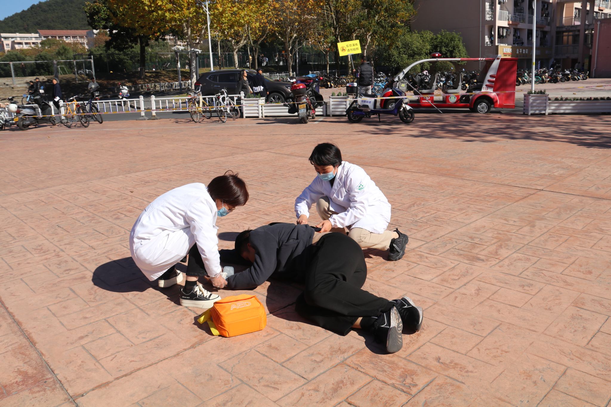 本次演练模拟食堂争端引起刀斧砍杀,威胁师生安全。食堂人员发现劝阻后第一时间向校110指挥中心报警,指挥中心接警后启动反恐防暴应急预案,3分钟内,学校应急小分队、交警到达现场,分工协作,进行人员疏散、交通管制,并快速将歹徒制服。卫生所医护人员接到警情后,在预定时间内赶到现场,救护伤员。