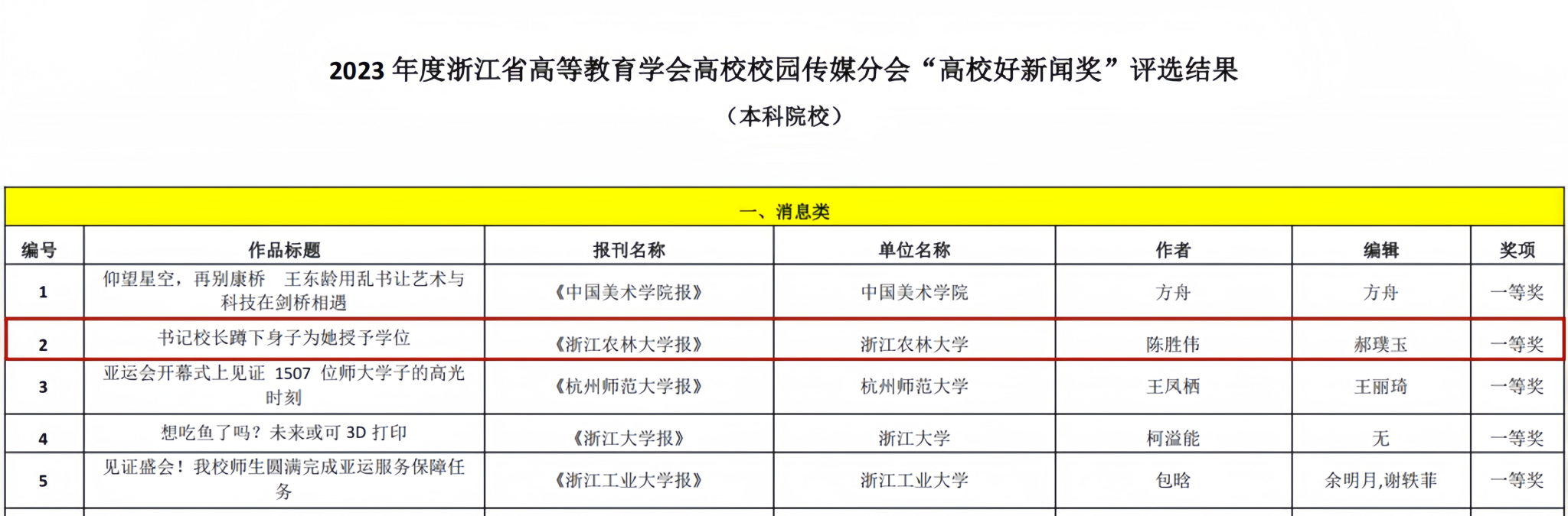 2023年度,beat365官网共有四件新闻作品获奖。其中《书记校长蹲下身子为她授予学位》获消息类一等奖,《beat365平台唯一官网报》2023年10月31日第697期第02.03版、2023年12月31日第699期第04版、2023年12月31日第699期第03版分别获版面类三等奖。