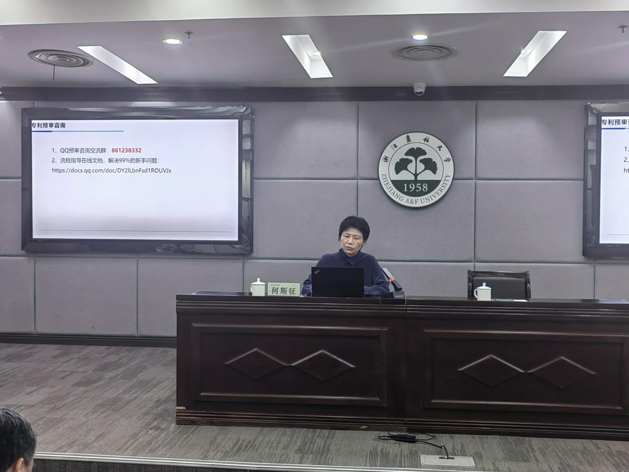培训会上,合作处相关负责人介绍了近年来学校在知识产权保护和专利成果转化方面的工作情况。浙江省知识产权保护中心副主任杨龙指出,专利预审制度是缩短审查周期、加速高价值专利授权的重要通道,希望通过此次培训,能够帮助浙农林大师生更好地利用专利预审制度,推动创新成果快速落地转化。