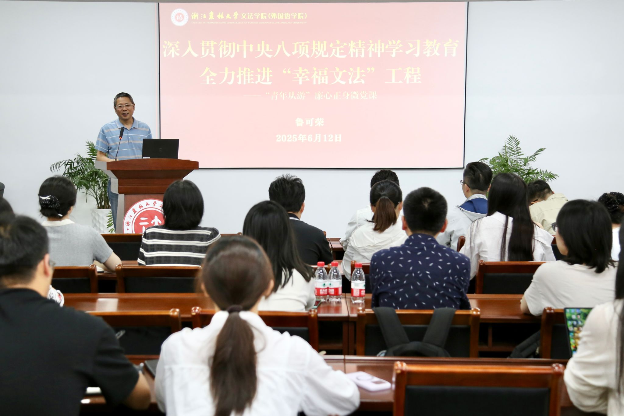 文法学院院长鲁可荣以《深入贯彻中央八项规定精神学习教育 全力推进“幸福文法”工程》为题,结合学院高质量发展实际,深入阐述了中央八项规定精神对营造风清气正办学氛围的重要意义,并深情鼓励青年教师在教学科研中严守纪律底线,以“一杆子插到底”的担当作为为学院内涵式发展添砖加瓦。文法学院党委副书记(主持工作)徐达以《深入贯彻中央八项规定精神学习教育 全力打造“勤廉文法”》为题,结合违反中央八项规定精神典型案例,深刻剖析了违纪违规风险点,他勉励青年教师筑牢思想防线,将“勤廉文法”要求融入日常教学、育人工作,以良好作风师德师风助力院风教风学风提升。
