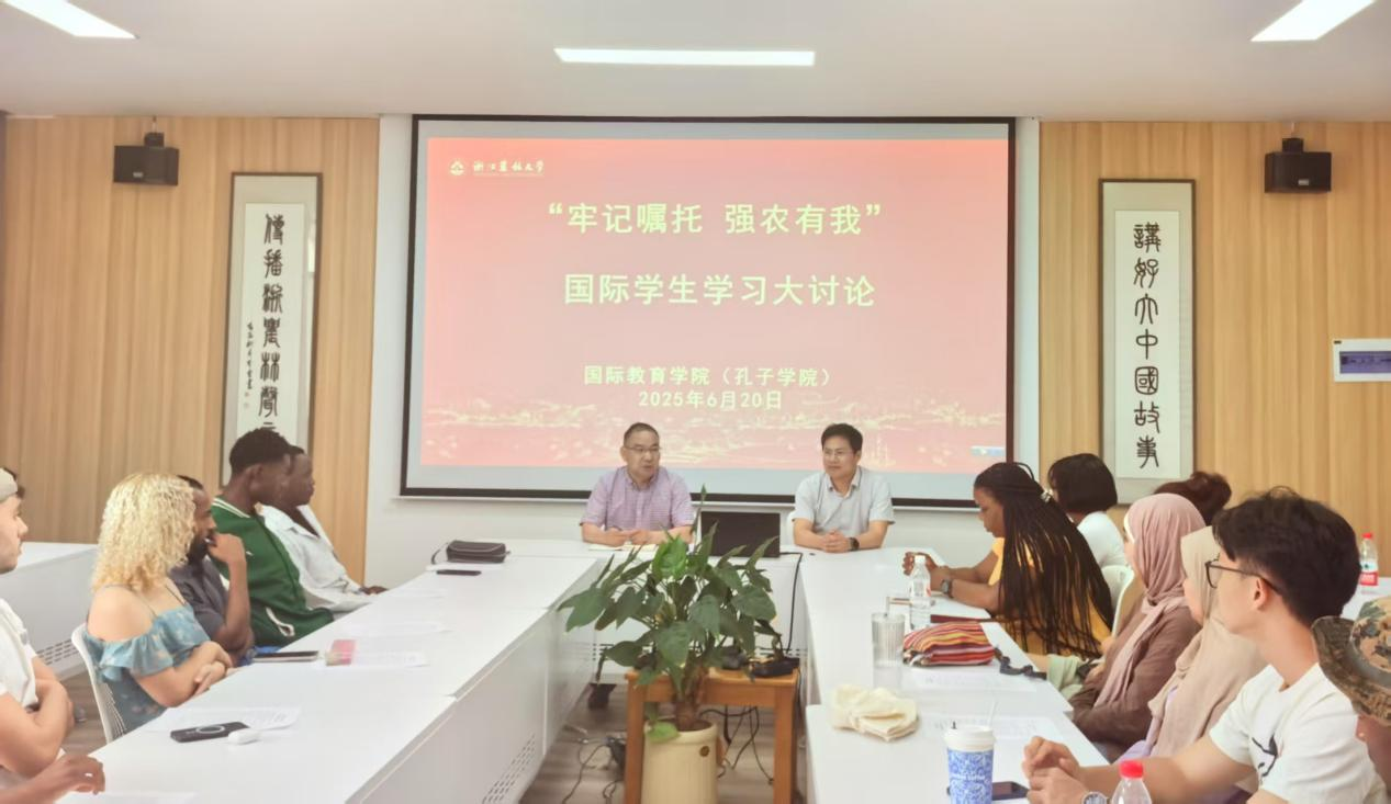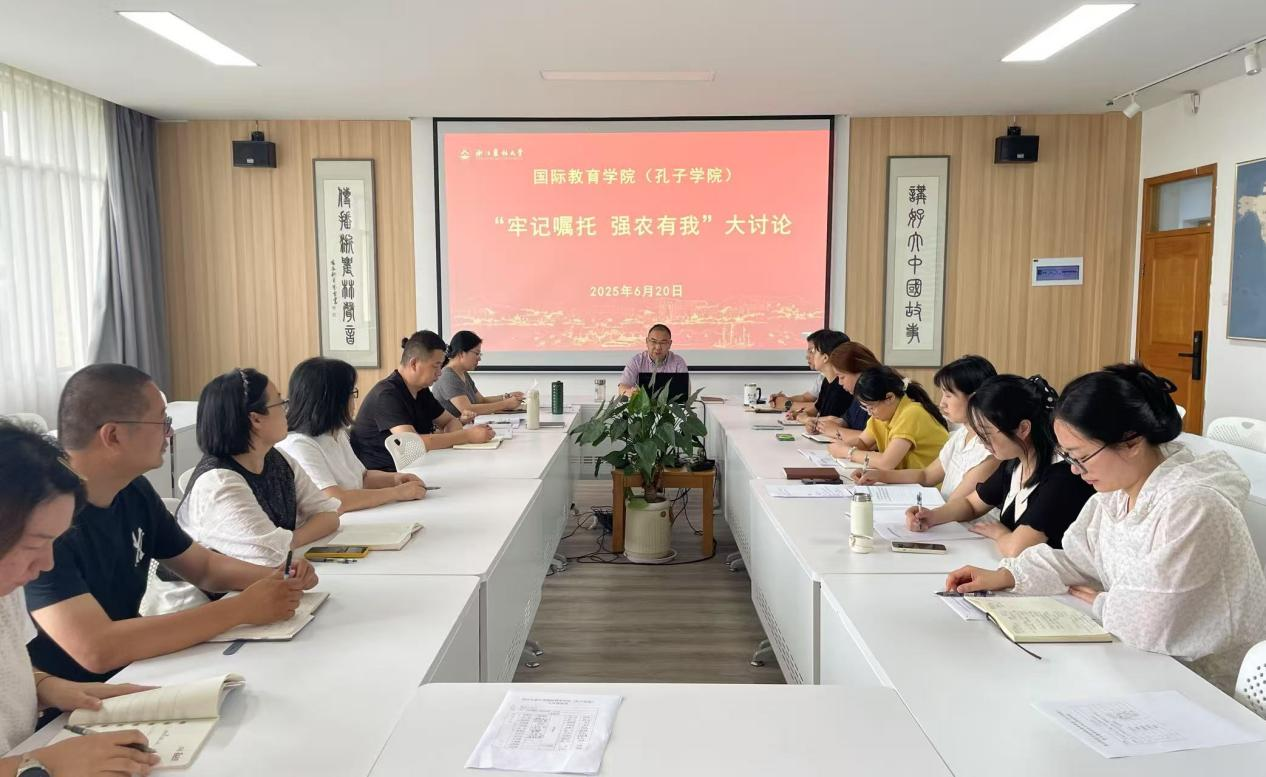 6月20日,国际教育学院(孔子学院)院长赵有华主持开展“牢记嘱托 强农有我”全院学习大讨论,探讨推进国际教育提质增效路径,全体教职工参加。