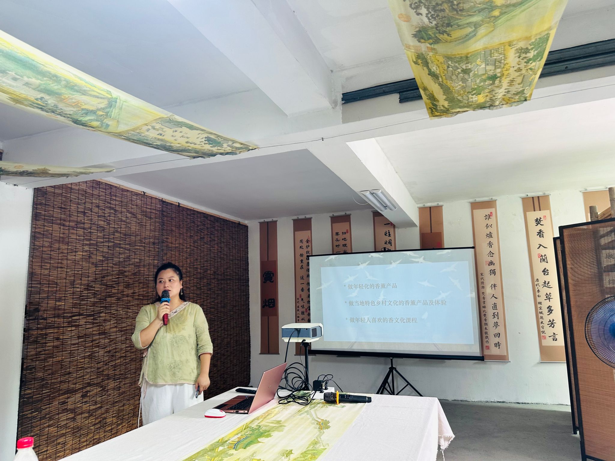 学员们来到位于余杭区径山镇前溪村的非遗文人制香工坊-宋韵香局,主理人陈龙和汪彬彬向大家详细介绍了目前业态的经营情况。在导师李震华的带领下,大家围绕“产业发展遇到的问题、痛点”等相关话题展开了激烈讨论,学员们各抒己见,并结合自身经历给出了发展建议和可行性做法。