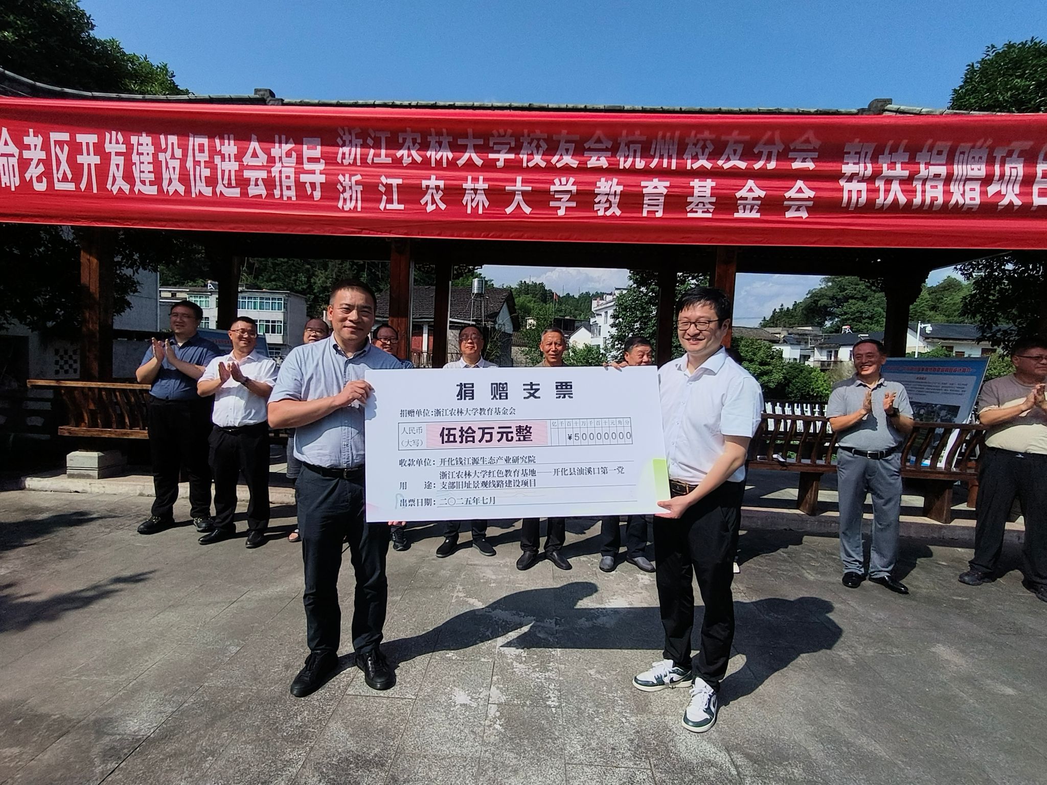 在开工仪式上,学校教育基金会向开化钱江源生态产业研究院捐赠50万元资金用于项目建设。开化钱江源生态产业研究院与开化县池淮镇油川村股份经济合作社签订了项目赠予协议。方志刚宣布项目正式开工。