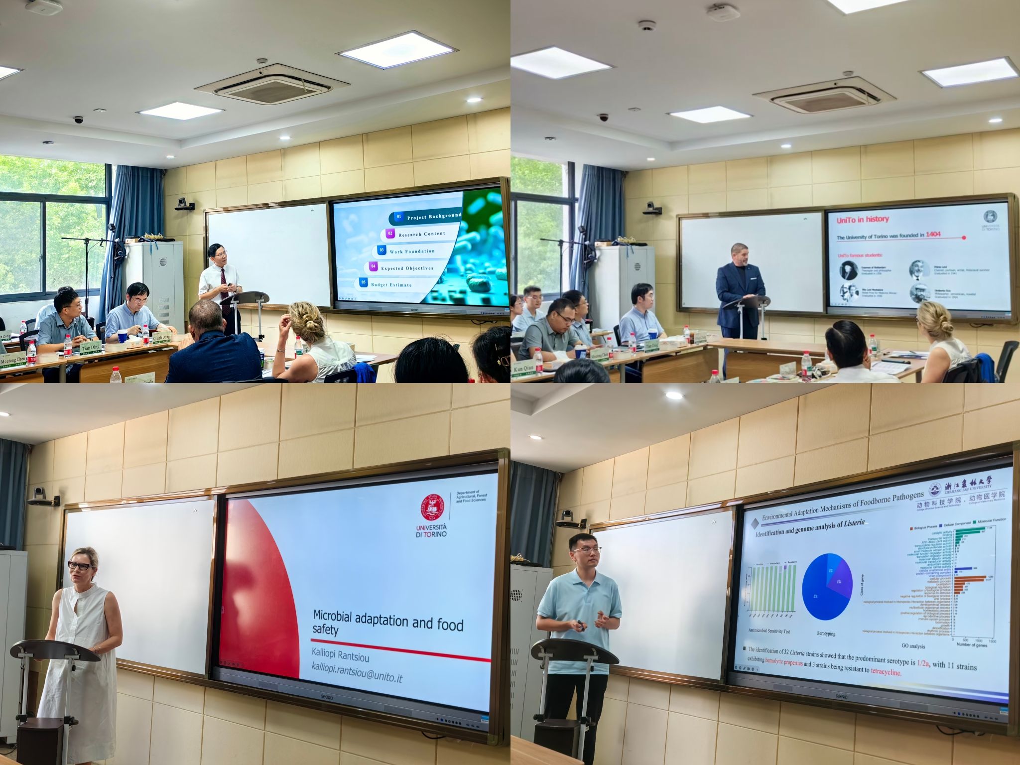 项目负责人、动科动医学院院长宋厚辉教授,详细介绍了项目的整体情况,包括项目目标、研究内容、双方所承担的任务以及考核指标等关键信息;项目合作方负责人、意大利都灵大学Luca Simone Cocolin教授,介绍了都灵大学的基本情况以及研究团队组成,为双方深入合作搭建了坚实的桥梁;项目组研究成员都灵大学Kalliopi Rantsiou教授和beat365平台唯一官网聂政博士,分别就双方开展的研究内容和最新进展进行了详细汇报。