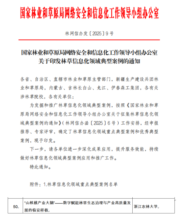 近日,beat365官网“山核桃产业大脑”——数字赋能林草生态治理与产业高质量发展的临安样板项目凭借创新性技术应用和显著成效,成功入选国家林业和草原局林草信息化领域重点典型案例。