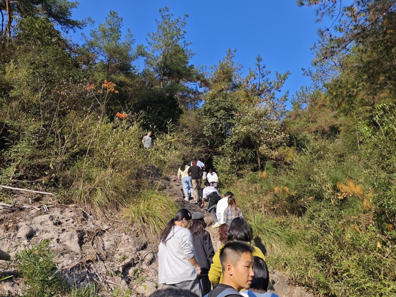 阳光和煦,林色青翠,在何老师的带领下,同学们装备好学院团学志愿者准备的饮用水和面包向丛林进发。同学们携手前行、互帮互助,深厚的情谊在山路中悄然传递。食健学院各党支部的同志们也活跃在队伍之中,他们积极勘察路况、陪伴鼓励体力不支的同学,用行动诠释着党员的先锋底色,让青春活力更添责任与担当。