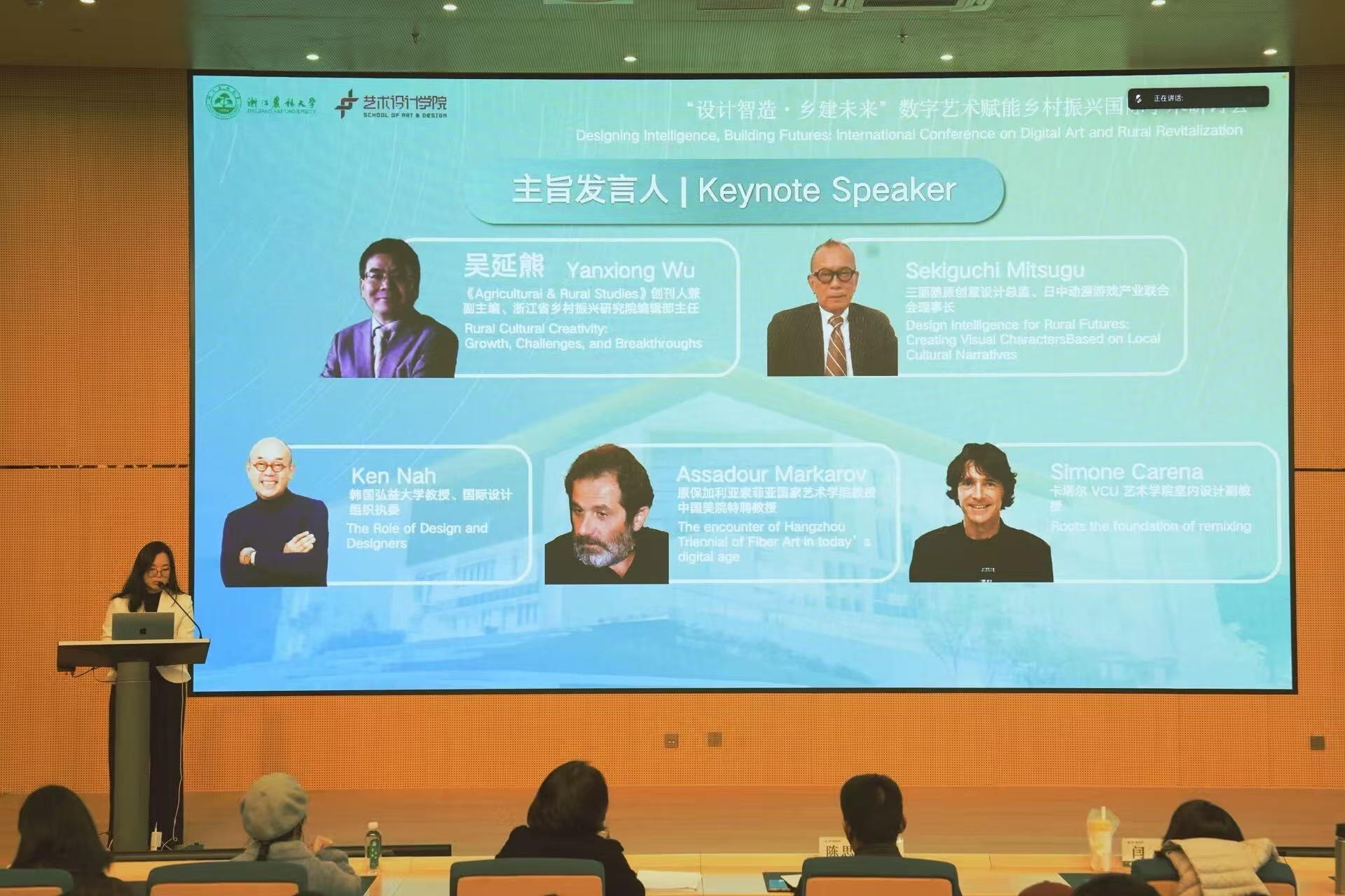 在主论坛环节,多位国际知名专家作主旨演讲:日中动漫游戏产业联合会理事长关口贡先生以“地域故事驱动的乡村视觉形象设计”为题,分享如何通过视觉叙事激活乡村文化记忆;韩国弘益大学Ken Nah教授强调“设计与设计师在乡村振兴中的战略价值”,呼吁培育跨界设计人才;原保加利亚索菲亚国家艺术学院Assadour Markarov教授以杭州纤维艺术三年展为例,探讨“数字时代乡村艺术的创新表达”;卡塔尔VCU艺术学院Simone Carena教授从“跨文化视野下的乡村设计融合实践”出发,提供多元文化背景下的乡村设计经验,《Agricultural & Rural Studies》创刊人吴延熊教授则是系统阐释“乡村文化创意的生长逻辑与突破路径”,为乡村文化振兴提供理论支撑。