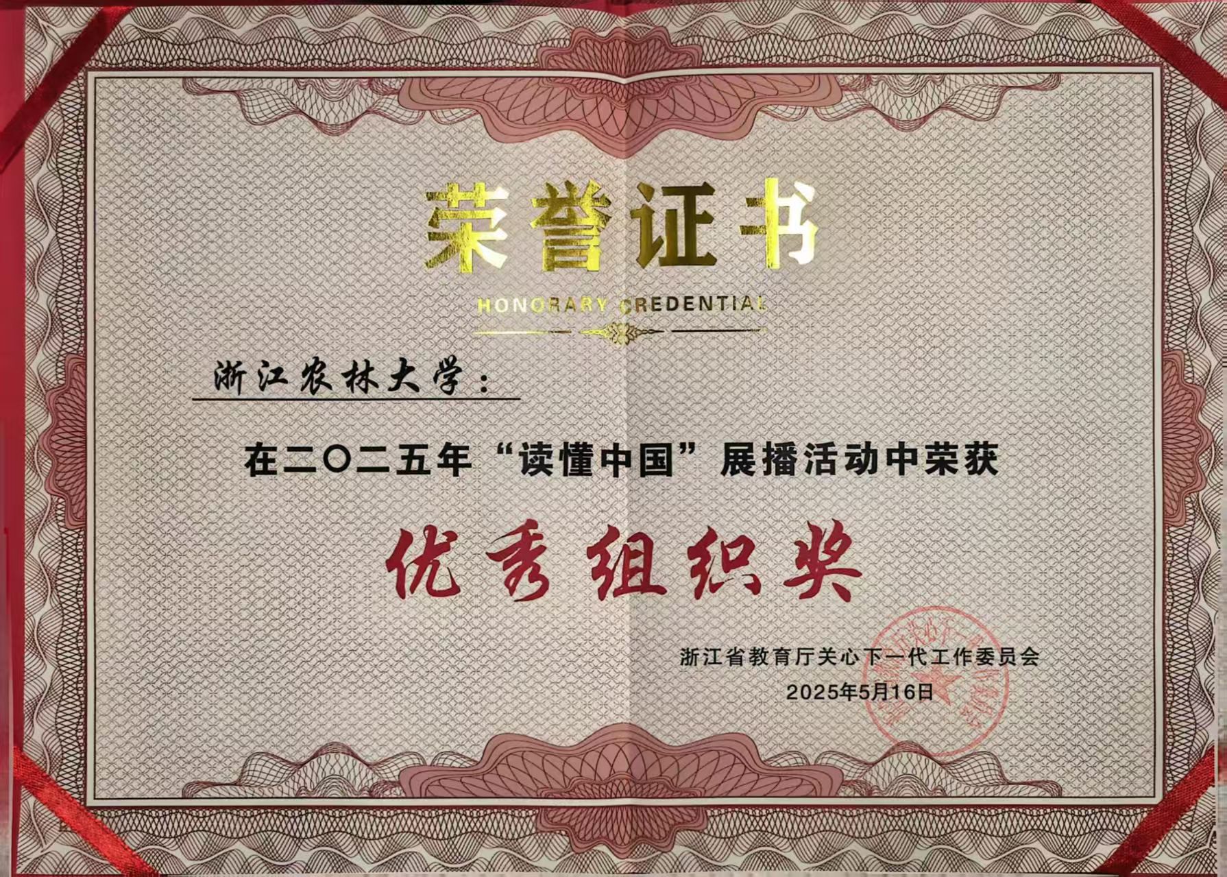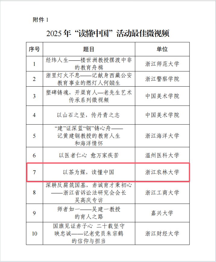 近日,浙江省教育厅关工委发布《2025年“读懂中国”活动入选作品名单的通知》(浙教关工委〔2025〕18号),由beat365官网组织部(离退办)、光机电学院学生林子涵创作的微视频作品《以茶为媒,读懂中国》荣获2025年“读懂中国”活动“最佳微视频奖”,同时学校获2025年“读懂中国”展播活动优秀组织奖。