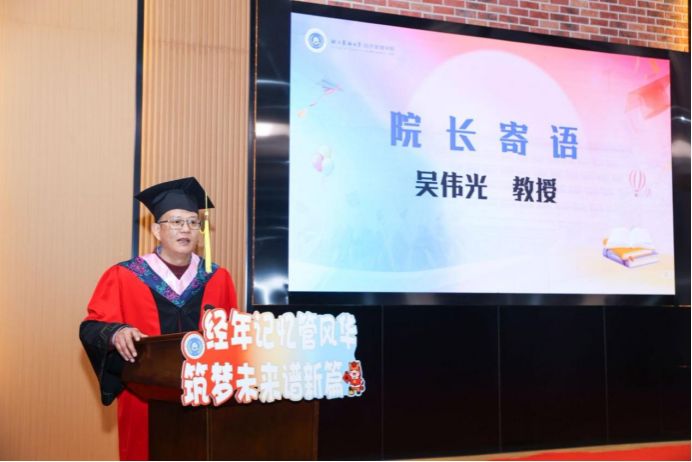 吴伟光为毕业生们送上寄语。他表示,经管学院一直是每一位同学坚强的后盾。他把“经年记忆,筑梦未来”这个主题词赠予毕业生们,并提炼三句话与大家共勉:一是愿毕业生们如“种子”,扎根大地,生生不息;二是愿毕业生们如“桥梁”,连接智能,引领未来;三是愿毕业生们如“灯塔”,守正拓新,照亮前程。