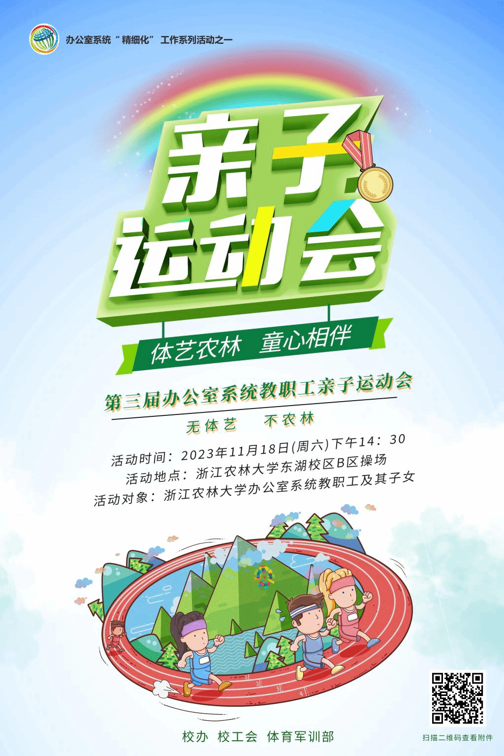 为践行“无体艺 不农林”理念,牢固树立“体艺育人,终身受益”的思想,着力提升办公室系统的凝聚力,进一步加强教职工家长与孩子之间的沟通交流,丰富教职工的业余生活。经研究,学校办公室、校工会和体军部联合举办“体艺农林 童心相伴”——beat365平台唯一官网办公室系统第三届亲子运动会,以切实增强全校办公室系统人员的责任感、归属感和幸福感。