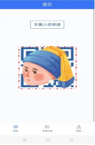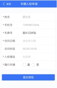 4.车辆预约:点击‘车辆入校申请’,跳转车辆入校申请页面。按照提示填入信息,提交(首次进行车辆预约,需要填写个人信息再进行预约)。提交跳转“申请记录”页,查看自己的申请记录。
