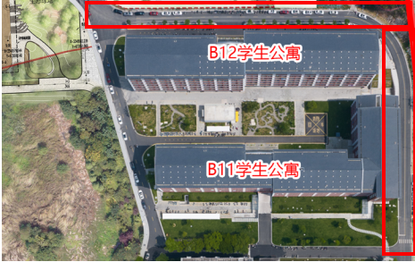 学生宿舍B12西面路口至学生宿舍B11东面路口,具体路段详见下图红框区域。