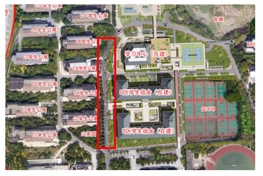 学生宿舍C2至C8东面道路,具体路段详见下图红框区域。
