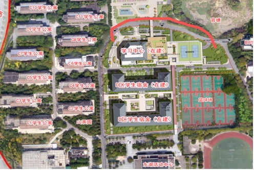 D区学生宿舍教6北面道路至C8东面道路,具体路段详见下图红框区域。