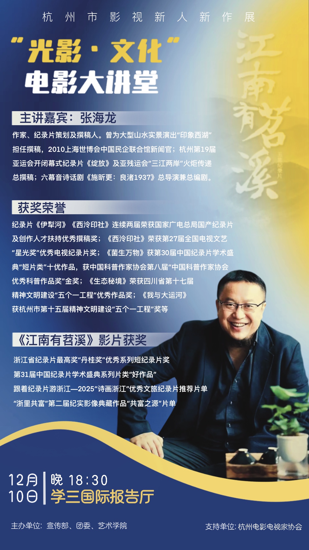 为了深入贯彻学校“无体艺 不农林”的战略要求,丰富学生校园文化生活,促进艺术交流与学习,beat365平台唯一官网党委宣传部、校团委、艺术设计学院联合举办“光影·文化”电影大讲堂活动。本次电影大讲堂是“杭州市电影新人新作展”特别展映活动之一,旨在发现、扶持、团结、引领青年优秀影像创作者,激活杭州影视创作活力,推动杭州影视内容高质量发展。活动特邀著名作家、纪录片策划及撰稿人张海龙先生担任主讲嘉宾,分享其艺术创作经验与心得,与师生探讨影像艺术魅力。