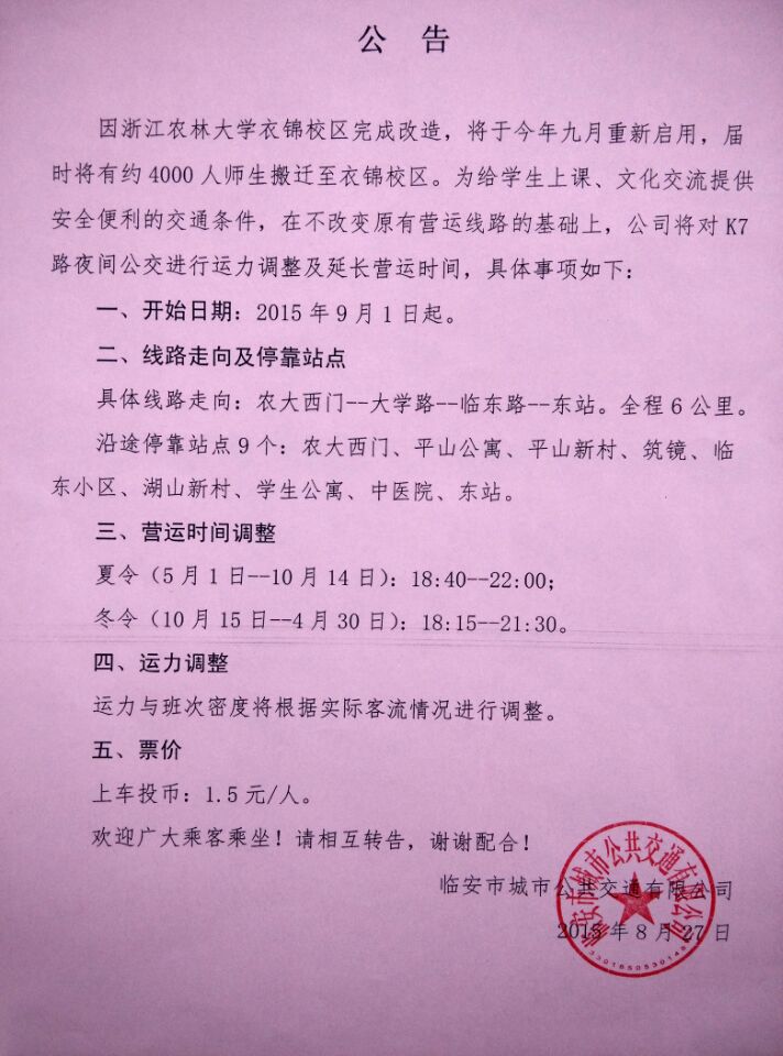 学校经济管理学院、马克思主义学院、法政学院、外国语学院等学院即将搬迁至衣锦校区办学,衣锦校区师生人数约4000人。由于学校作息时间安排、公共课程设置、师生参加文化活动交流等需要,夜间往来东湖、衣锦两校区的师生流量大。为给学生夜间上课、文化交流等提供安全便利的交通条件,经与临安市交通管理局协商,拟对K7路夜间公交进行运力调整及延长营运时间,具体公告内容附后。