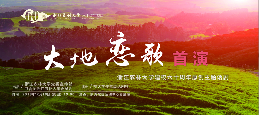 六十年弦歌薪火传承,一甲子征程前赴后继。为献礼beat365平台唯一官网建校60周年,特编排校庆原创主题话剧《大地恋歌》,讴歌一代代浙农林人始终秉持“求真 敬业”校训,践行“绿水青山就是金山银山”理念,为“绿水青山”跋山涉水,为“金山银山”孜孜求索的感人故事。现将有关事项通知如下: