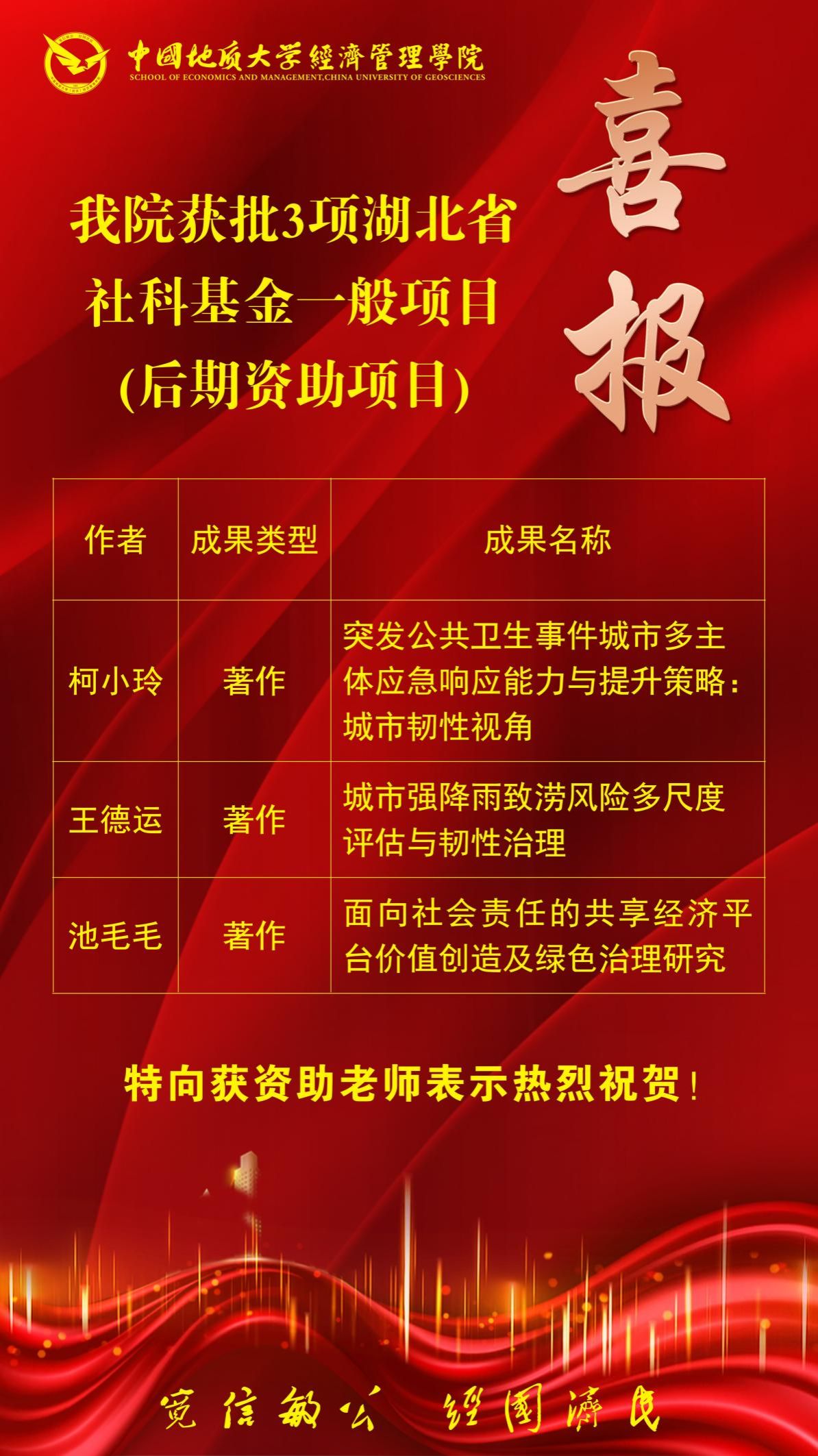 (通讯员 胡松琴)11月14日,2023年度湖北省社科基金一般项目(后期资助项目)拟立项名单公布,vwin德赢ac米兰官方网柯小玲、王德运、池毛毛三位老师申报的课题项目成功立项,我院科研成果再次喜获丰收。
