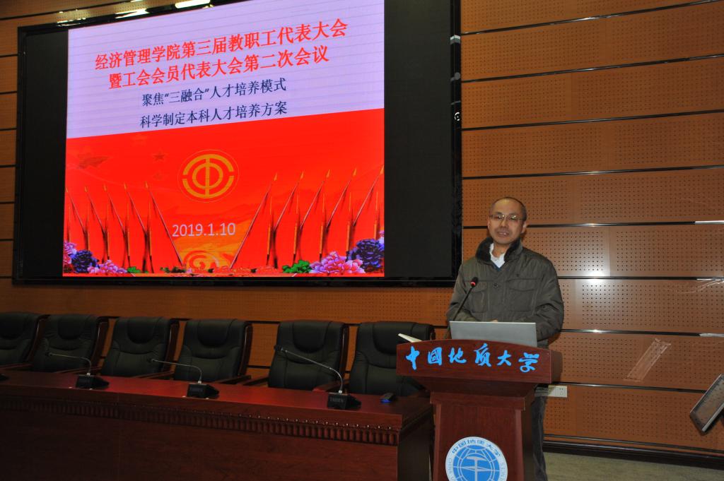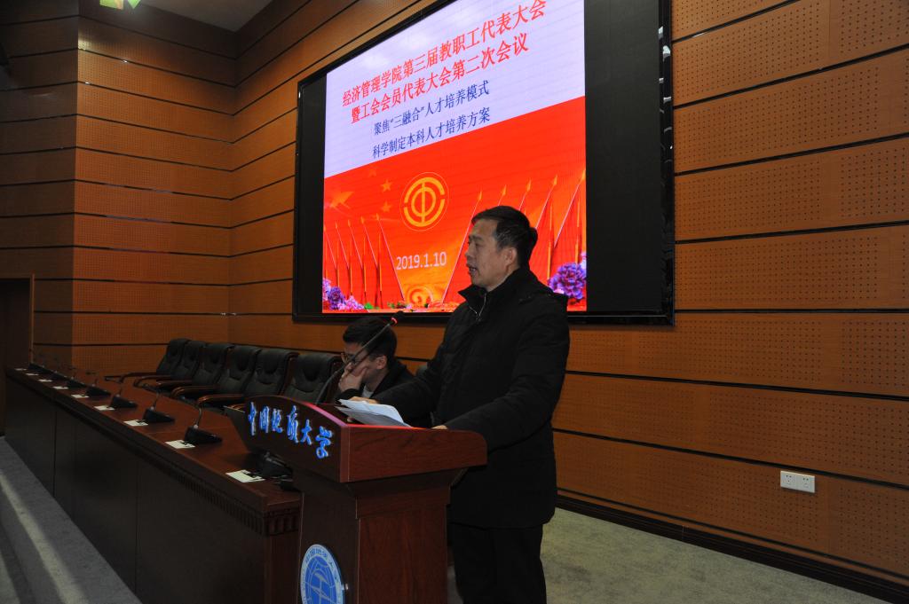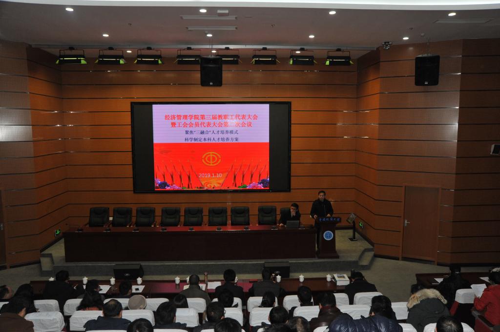 (通讯员周玲,摄影赵谦、王萍)2019年1月10日,vwin德赢ac米兰官方网第三届教职工全体会议暨代表大会第二次会议在东区综合楼A0113报告厅如期召开。本次大会由包括学院教职工代表在内的全体教职工参加,以“聚焦‘三融合’人才培养模式,科学制定人才培养方案”为主题。 校党委常委、副校长刘勇胜同志、校工会常务副主席喻芒清同志出席会议。