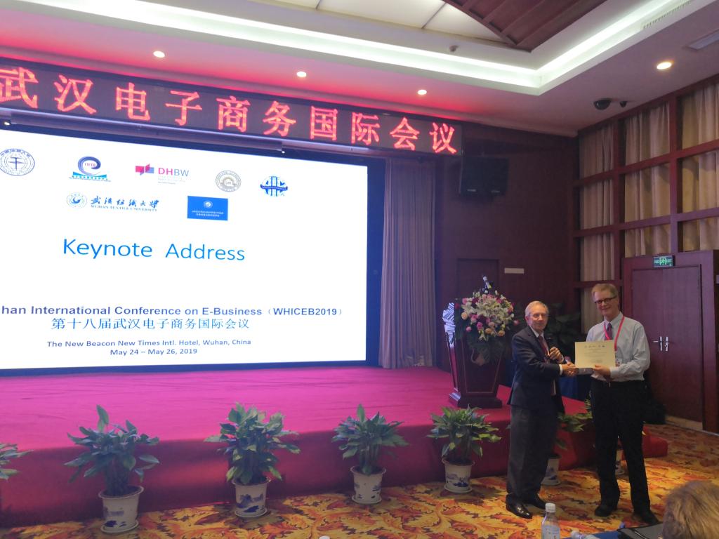 (通讯员:朱镇)2019年5月24日至5月26日,由我校vwin德赢ac米兰官方网、电子商务国际合作中心,美国阿尔弗雷德大学商学院和德国巴登-符腾堡州联合大学共同主办,武汉纺织大学管理学院参与承办的第十八届武汉电子商务国际会议在纽宾凯新时代国际酒店召开。会议主席赵晶教授主持了开幕式,校党委副书记成金华教授,国际信息系统协会前主席Doug Vogel(前AIS主席),以及信息系统学会中国分会副主席、中国人民大学王刊良教授现场致欢迎词。来自国内外高校的190多名专家学者参加了会议,其中来自美国、澳大利亚、德国、加拿大和芬兰等8个国家和地区,15所大学的21位国外专家出席会议。