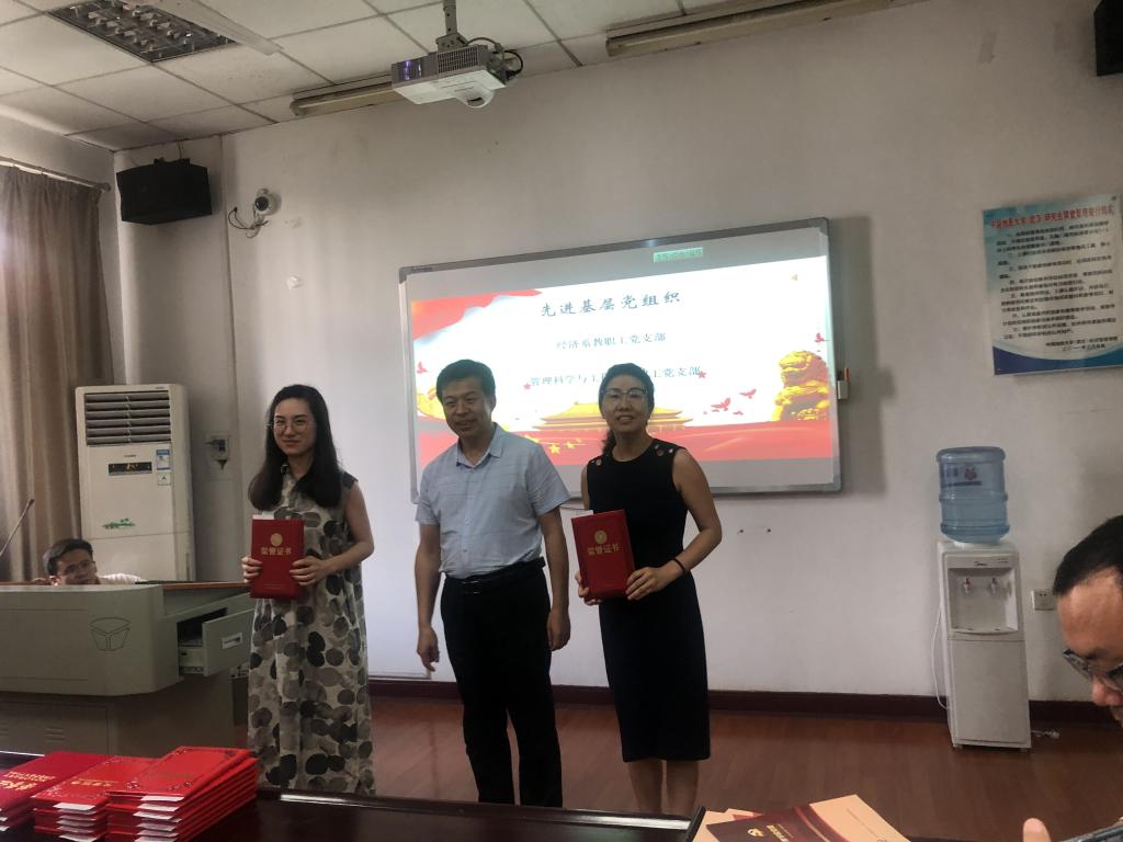 院长杨树旺宣读《中共vwin德赢ac米兰官方网委员会关于表彰2018-2019年度学院先进基层党组织、优秀共产党员、优秀党务工作者和师德师风道德模范的决定》。经济系教职工党支部、管理科学与工程系教职工党支部获评学院先进基层党组织;肖建忠、王广民、 李江敏、王然、龚承柱、田昆同志获评学院优秀共产党员;齐睿、孙涵、梁玥琳获评学院优秀党务工作者;朱冬元、 江毅、吴磊、余敬、屈文彬、徐德义、梁玥琳、隆雁翔同志获评学院师德师风道德模范。院党委书记杨昌锐为获得学院奖励的集体和个人颁奖。