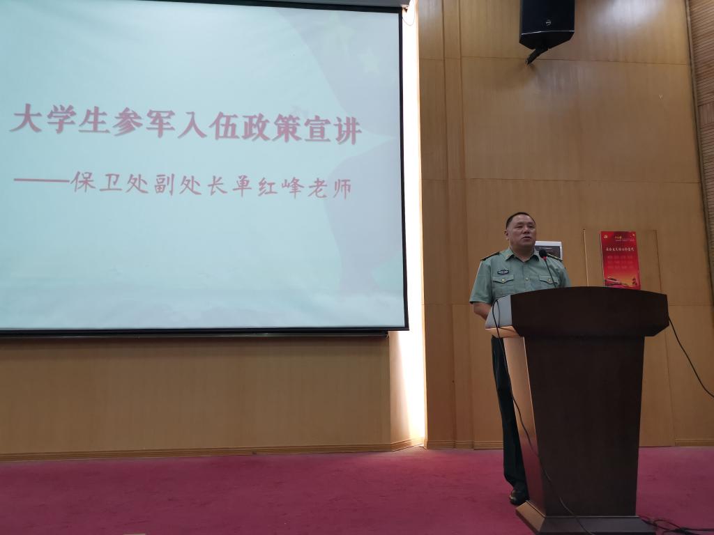 会上,学院特别邀请到保卫处副主任单红峰老师为新生们进行大学生参军入伍政策的宣讲。单老师关于入伍政策的讲解清晰易懂,深入浅出地分析了当前国际形势的风云变化,更为大家上了一堂极富家国情怀的爱国主义教育课。单处长阐述了大学生入伍的必要性及其对大学生成长的促进和帮助,并重点强调了军训安全问题,同时为2019级新生军训送上祝福。