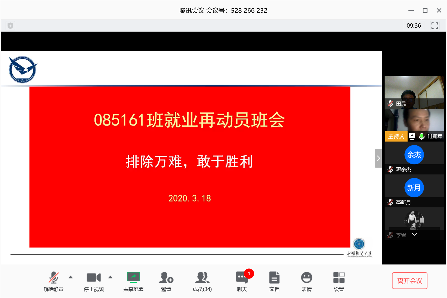 3月18日晚19:30,vwin德赢ac米兰官方网旅游管理专业085161班“排除万难,敢于胜利”就业再动员主题班会顺利举行。受到疫情影响,本次会议通过腾讯会议平台以线上形式开展,班主任、旅游系系主任肖拥军,学院16级辅导员田昆及旅游管理专业085161班全体毕业生共36人参加会议。