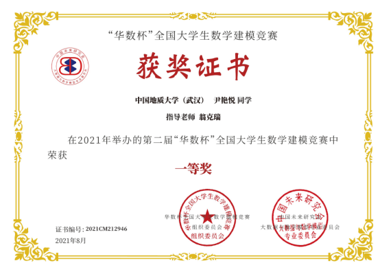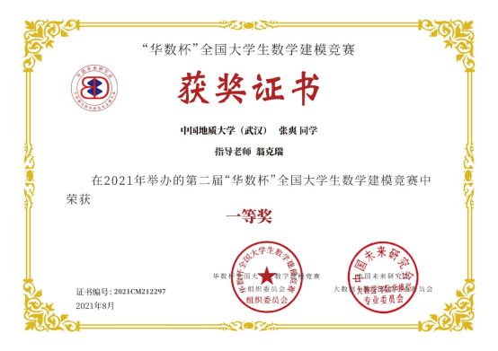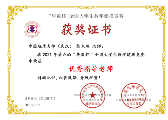 2021年第二届“华数杯”全国大学生数学建模竞赛于2021年8月5日-8日举行,本次竞赛共吸引2189支队伍参赛,竞赛专家组经过初评、网评、会评和复审四个阶段的评审,评选出一等奖184支,二等奖370支,三等奖550支。我院翁克瑞老师带队的2支队伍获一等奖,1支队伍获二等奖:李林森、 张爽、李佩的队伍获一等奖;刘林凯、尹艳悦、 程浩鋆的队伍获一等奖;潘信、郑咏杰、裴璇子的队伍获二等奖。此外,我院贲雅雯同学的队伍在数理学院付丽华老师带队下获三等奖。翁克瑞老师被评为 “优秀指导老师”。