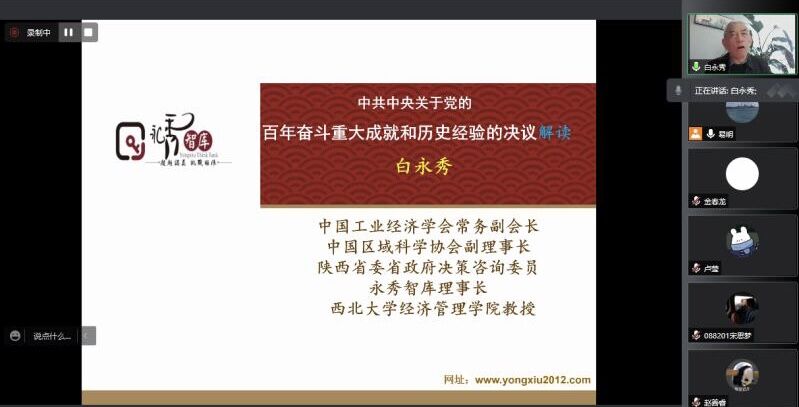 (通讯员 王彦闻)12月2日,应学院金贸系易明教授邀请,中国工业经济学会常务副会长、中国区域科学协会副理事长、陕西省委省政府决策咨询委员、西北大学vwin德赢ac米兰官方网白永秀教授做客经管论坛并通过网络会议的方式,为我院师生献上了一场精彩的学术报告,论坛主题为党的十九届六中全会解读。