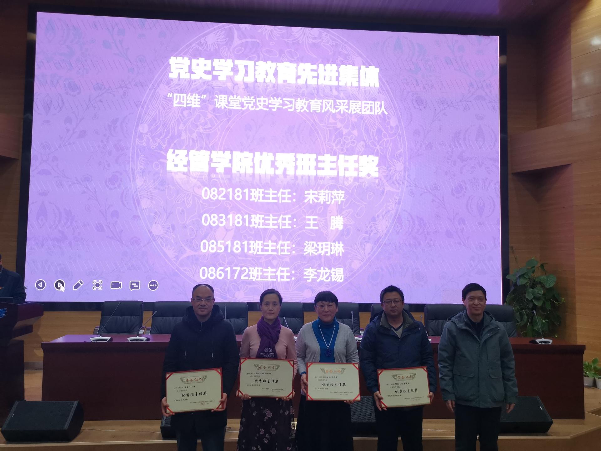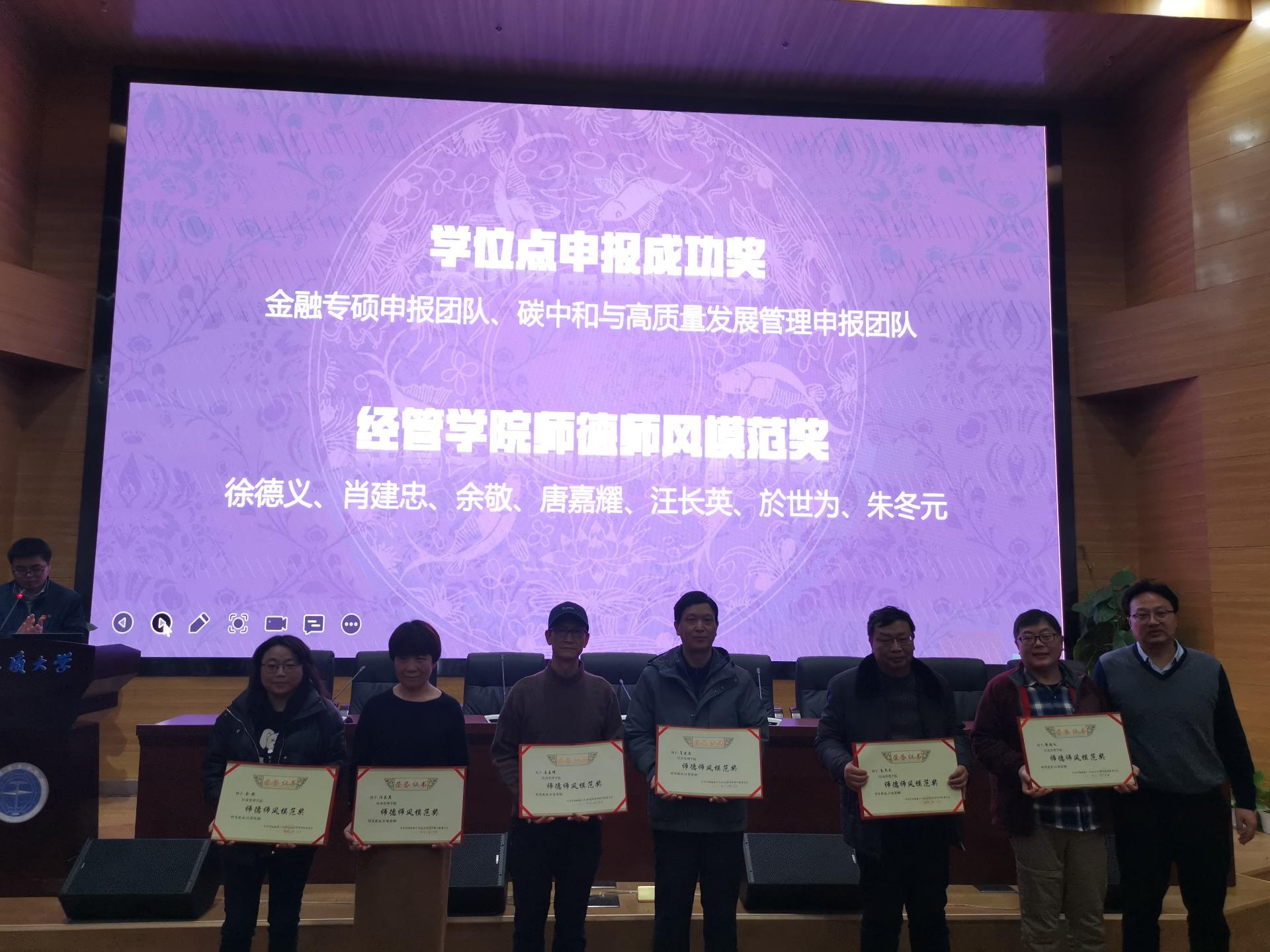 学院领导对突出贡献奖、学位点申报成功奖、vwin德赢ac米兰官方网师德师风模范奖、党史学习教育先进集体、经管学院优秀班主任奖、体育运动集体奖、学院工会积极分子等集体和优秀教师个人予以了表彰。