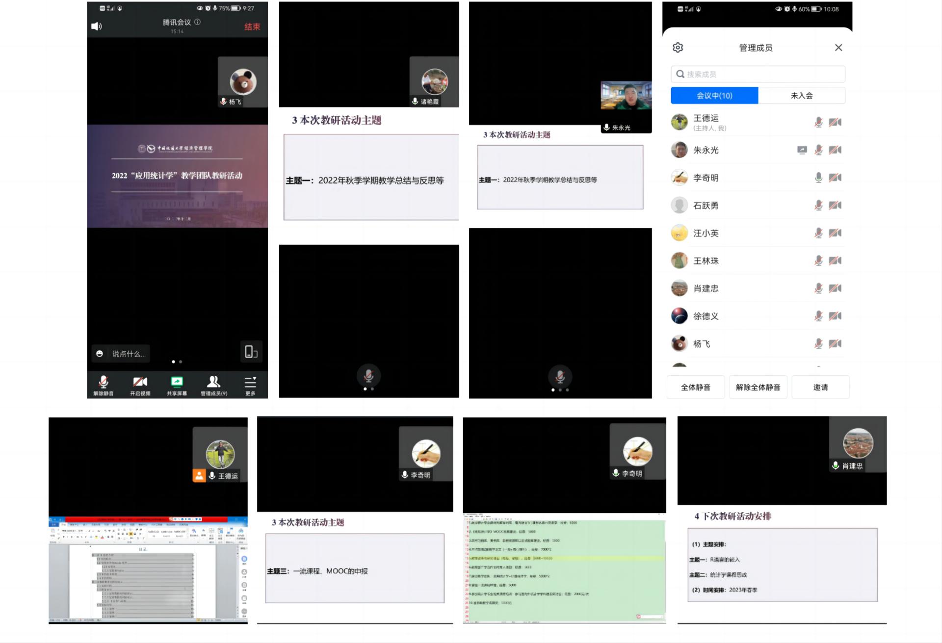 2022年12月8日,我院统计学教学团队于线上开展了第一次教研活动。本科生院副院长杨飞教授、我院副院长肖建忠教授全程参与了讨论并分别给出了建议或指导意见。统计学教学团队成员徐德义、李奇明、王德运、王林珠、汪小英、诸艳霞、石跃勇、朱永光等参加了本次活动。本次教研活动以2022年秋季学期教学总结与反思、配套教材的编写、一流课程申报三大主题展开,教学团队成员进行了充分的讨论,取得了良好效果。