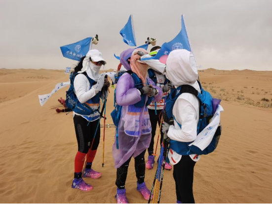 赛程第二天,气温下降,天气变化突然,比赛途中历经沙漠狂风、大雨、烈日等恶劣环境,沙11队员们照顾着彼此,不离不弃,携手前行。赛场上天气瞬息万变,队员们始终保持组队前行。