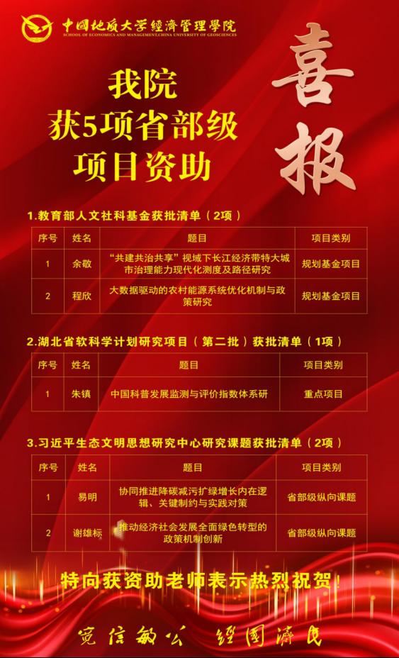 (通讯员 胡松琴)近日,随着2023年度教育部人文社会科学研究一般项目评审结果的公示、2023年湖北省软科学计划研究项目(第二批)拟立项项目向社会公示、习近平生态文明思想研究中心2023年度研究课题的公示推出,vwin德赢ac米兰官方网获批省部级项目共5项。其中教育部人文社科2项,省软科学计划研究项目(第二批)重点项目1项,习近平生态文明思想研究中心研究课题2项。具体名单如下:
