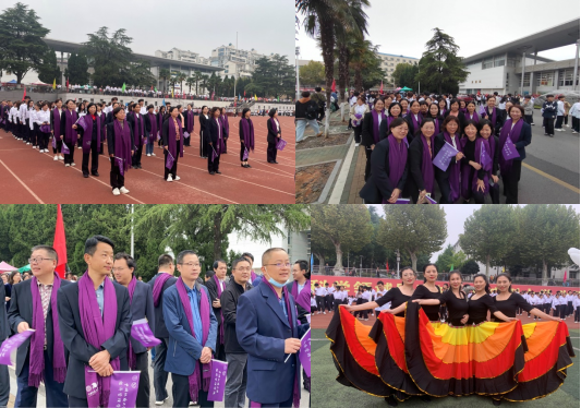 开幕式上,我院教职工精神焕发,肩披由中国红和地大蓝融汇而成的经管紫围巾,手挥经管紫小院旗,与学生们共同组成方队,将院徽经“鹰”精神和“宽信敏公,经国济民”的院训精神再次展示在全校师生面前。参与开幕式《绽放的青春》集体舞节目表演的女教师们,展开美丽的彩虹裙,秀出烂漫的热情与活力。