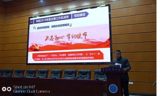下午,各系主任报告2019年目标责任制实施状况和改进措施,以及交流对学院教学、科研、学科建设、人事等管理制度的建议。经济学系齐睿同志和旅游管理系李江敏同志作专题报告。然后,教职工代表对2019年度工作报告、财务工作报告和工会工作报告进行举手表决,形成大会决议。大会上表彰了学院年度优秀教师,授予邹伟进和刘宇清两位荣休教师“卓越贡献奖”。最后,学院党委书记杨昌锐同志致闭幕词,大会在奏唱国际歌中胜利闭幕。