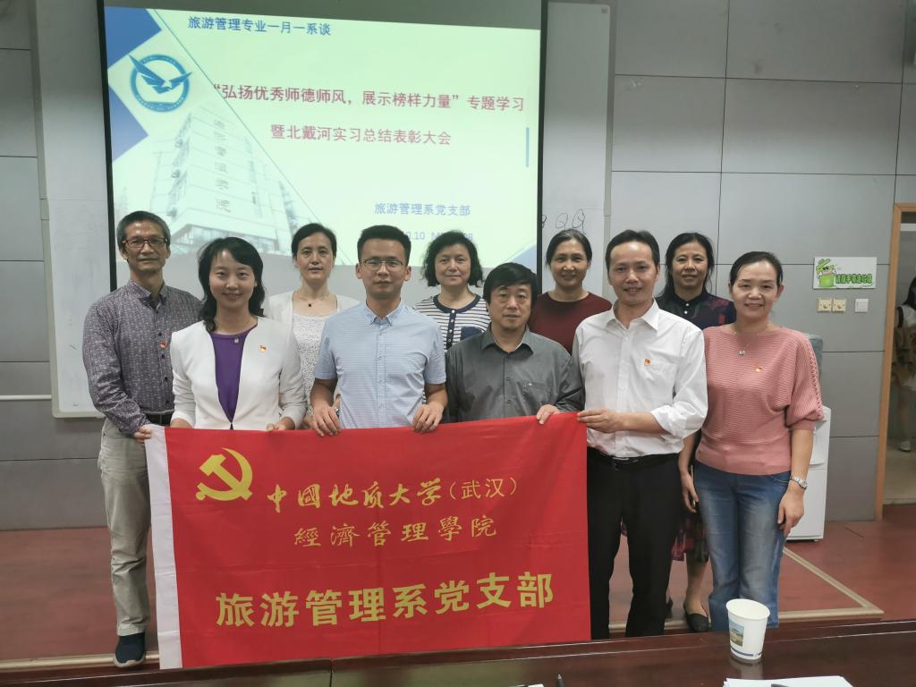 2019.10.10下午,vwin德赢ac米兰官方网旅游管理系党支部邀请学院学工组,共同组织旅游管理系085181班、经管学院08s197班,以及旅游管理系2019级研究生,在MBA208召开了“弘扬优秀师德师风,展示榜样力量”专题学习暨北戴河实习总结表彰大会。参加本次活动的有经管学工组赵家玮老师,旅游管理系李江敏、肖拥军、李会琴、鄢志武、唐嘉耀、梁玥琳、庄小丽、张俊霞、董淑霞等10位老师。